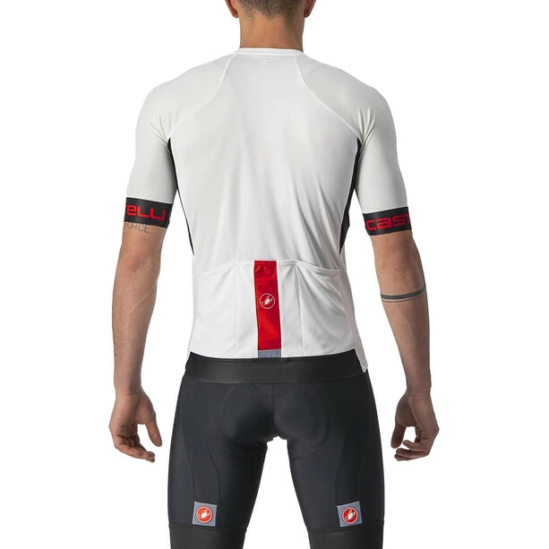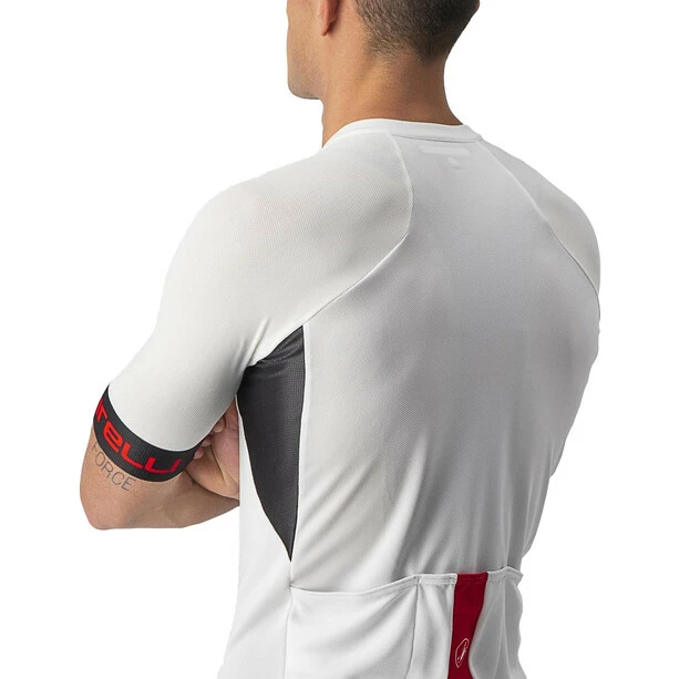 Das Entrata Trikot ist mit einer Menge Technologie ausgestattet. Obwohl es technisch gesehen das Einsteigertrikot in der Castelli-Kollektion ist, wurde es so entwickelt, dass es so viel Leistung wie möglich auf Rennniveau bietet und gleichzeitig ein unübertroffenes Preis-Leistungs-Verhältnis aufweist. Durch die einteiligen Ärmel mit aerodynamisch optimierten Nähten profitiert es von den Erkenntnissen aus Castellis Rennforschung. Es ist nicht nur aerodynamisch, sondern auch bequemer dank des Vier-Wege-Stretch-Air-Mesh-Gewebes und des roh geschnittenen Ärmelabschlusses, der dehnbar ist und sich jedem Arm anpasst, ohne einzuschränken. Das Hauptmaterial hat genau das richtige Gewicht, um Sie kühl zu halten, während die ProSecco-Behandlung Feuchtigkeit nach außen transportiert, um Sie trocken zu halten. Der dehnbare Stoff sorgt für eine optimale Passform und bietet einen Sonnenschutz mit UPF 30, der 97 % der UV-Strahlen filtert. Durchdachtes Design und funktionelle Details wie das Stretch-Panel in der Mitteltasche, der hochreflektierende Einsatz auf der Tasche, der durchgehende, leichtgängige YKK Vislon-Reißverschluss und das elastische Silikonband, das die Rückseite des Trikots in Position hält.