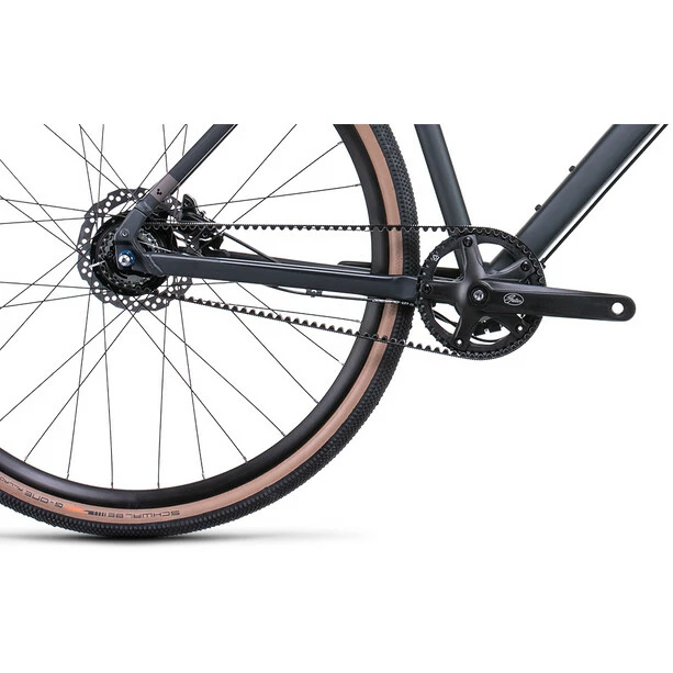 Bei der Entwicklung des Hyde hat CUBE sich an den Mountainbike Hardtails orientiert. Doppelt konifizierte Aluminiumrohrsätze und schnelle 700C Reifen sorgen für ganz viel Vorwärtsdrang und hohen Fahrkomfort, nahtlos integrierte Montagepunkte ermöglichen die individuelle Nachrüstung mit Gepäckträger und Schutzblechen. Über das Exzenter Tretlager kann der wartungsarme Zahnriemen gespannt werden. Die Rahmenöffnung um den Riemen montieren zu können befinden sich unaufällig oberhalb des Ausfallendes. Schließlich komplettiert die schlanke, steife Gabel den Rahmen, ihr Spezialgebiet: ein knackiges, präzises Lenkverhalten in Kombination mit wenig Gewicht und einem dezenten Look.