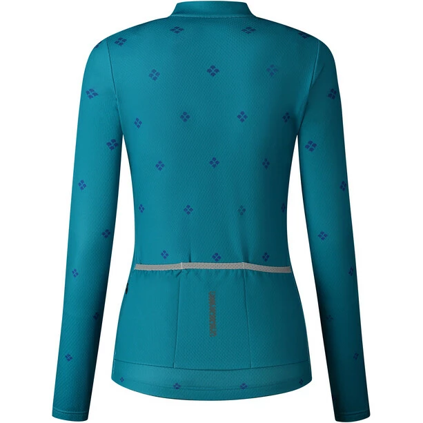 Das Kaede Printed Long Sleeve Damen-Jersey von Shimano ist ein sehr funktionales und modisches Thermo-Langarmtrikot und bietet bei kaltem Wetter optimalen Wärmerückhalt. Sein weiches, leichtes Gewebe sorgt für angenehmen Tragekomfort. Silikongripper an der Taille verhindern ein Hochrutschen des Trikots, damit die untere Rückenpartie zuverlässig vor Auskühlung durch den Windchill-Effekt geschützt ist. Drei Rückentaschen mit reflektierendem Band und eine schweißdichte Seitentasche mit Reißverschluss stehen dir für dein „Mitnahmegepäck“ zur Verfügung. Der verdeckte Reißverschluss sorgt dafür, dass das Trikotdesign unverändert bleibt indem es nicht durchbrochen wird. Reflektierende Elemente an Brust und Rückentasche und die Ausstattung der Rückentasche mit einem reflektierenden Band leisten dir eine deutlich verbesserte Sichtbarkeit bei schlechten Lichtverhältnissen.